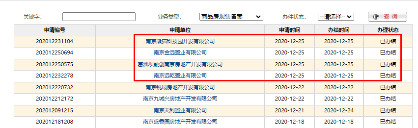 在南京市房管部门的官网上,记者发现这些楼盘的领证信息多为“已办结”或“正在办理”,仅12月25日一天便持续更新了15家楼盘之多。包括位于热门板块河西的滨江one,江心洲的纯新盘荣盛江天瓴筑,城南的章泰观南府,以及鼓楼滨江的以及仙林的纯新盘。此外,还有江宁方山的樾山林语园,上秦淮的葛洲坝融创紫郡府、秦尚栖庭,正方新城的远洋山水,以及溧水的悦峰府、恒大悦龙台、橡树城、文汇苑,高淳的高淳雅园、睦水香邻花园,六合的荣鼎幸福城 、珑翠芳庭东园等。