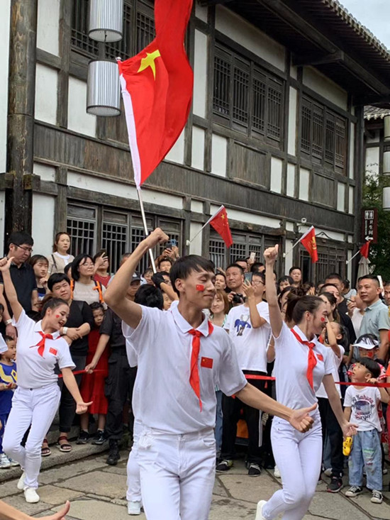 此外,近100位演艺人员在节日期间特别定制了一场国庆限定爱国快闪。当耳熟能详的经典爱国歌曲响起时,胸前佩戴着红领巾的爱国青年们用快闪舞蹈的形式展现出华夏儿女自强不息本色,现场游客们共同高声合唱,祝愿祖国母亲繁荣昌盛。