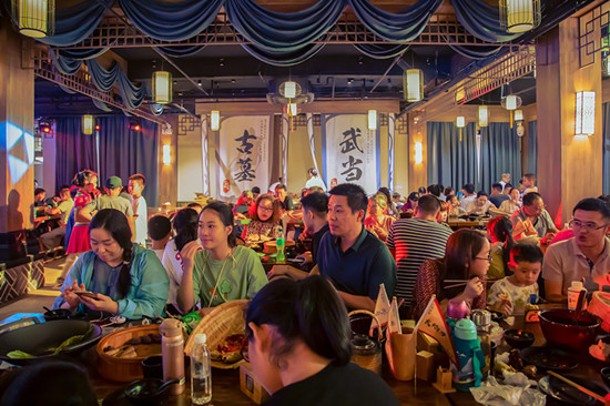 国庆期间,嘻哈道、笑忘江湖路秀、街头杂耍等经典演出颇受好评,以江湖为魂,演出为核,餐饮为配套的武侠主题餐秀每天更是加开4场,让游客在武林盛会中大快朵颐。夜晚华灯初上,大型实景水幕光影秀《逍遥游》、烟花大会燃爆全场,商业、餐饮人流攒动,通过景区+大型演艺的模式打造,山镇夜游经济火爆。
