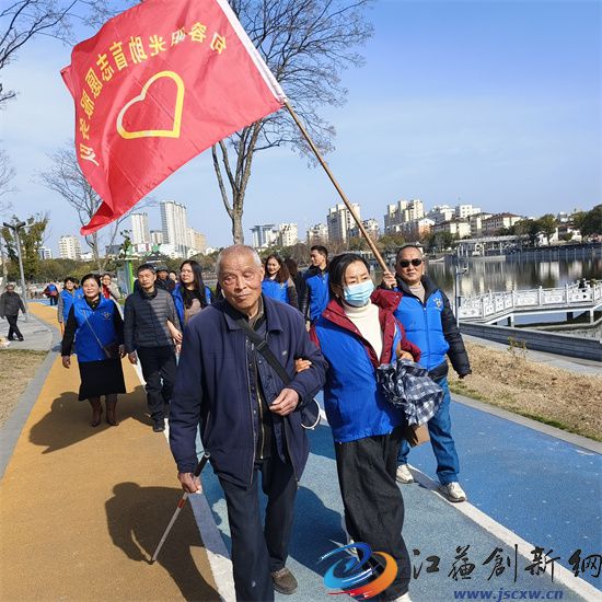 下午一时左右,近10名盲人在志愿者的引领下,到市区华阳南路农行门前汇合,然后,在志愿者的引领下,徒步来到葛仙公园南大门前集中,开启特殊的游园之旅。