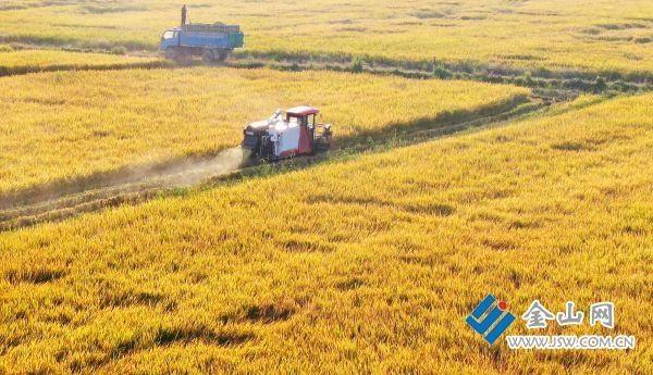 春种一粒粟,秋收万颗子。金秋时节,在句容郭庄镇万亩良田示范基地内,一片片稻田随风翻起金色的波浪。收割机穿梭在田间地头,切割、脱粒、粉碎秸秆等工序一气呵成,不一会,一辆小型农用车就装满了稻谷。