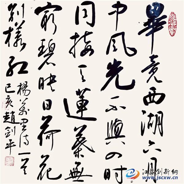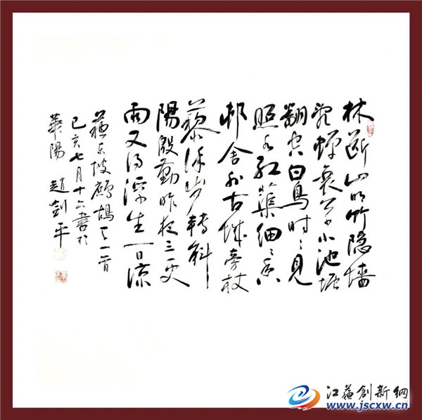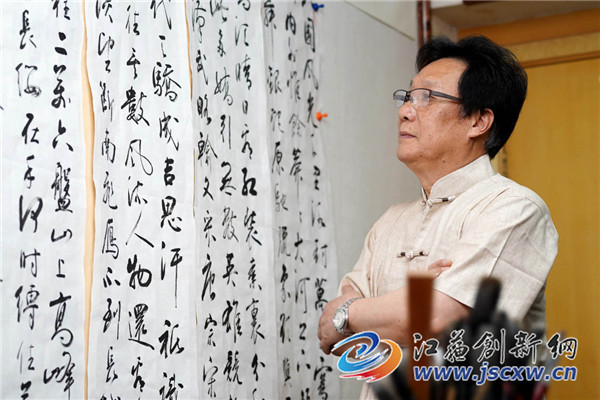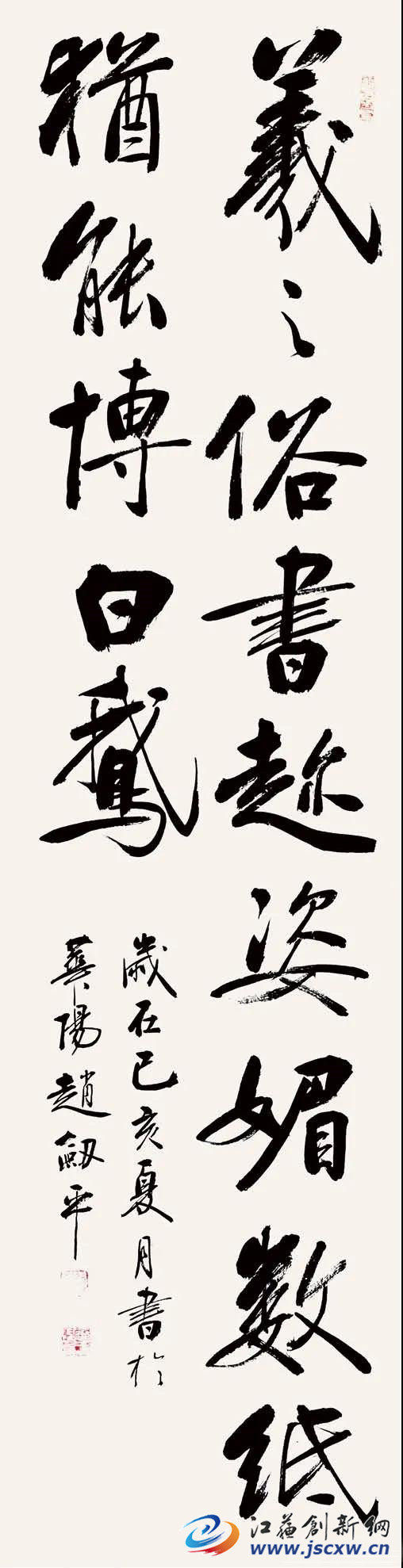 赵剑平先生退休以后似乎迎来了人生第二次青春,他曾经说过,退休后潜心学习书法,时间充裕精力集中。赵先生的书房总是满屋墨香,临写与创作的书法作品,堆积在地板上,悬挂在墙上真是风光无限。其实,赵剑平先生在年轻的时候就对书法艺术非常热爱,也具有先天的禀赋,这是他成就书艺的必要前提。虽然他很谦虚地认为自己的书艺成就来自退休后的数年努力,他甚至认为自己十年前写的书法作品问题很多缺点也不少。这是一个具有反思精神与自我鉴定的人的优秀品质,也是成就一个优秀书法家的必备素养。(文/卞瑞 图/赵剑平)