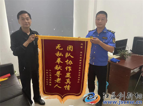 江苏创新网讯 7月26日,南京市民仵先生将一面印有“无私奉献寻老人,团队协作显真情”字样的锦旗送到句容市城管局乡镇执法大队宝华中队,表达对城管队员王银和同事们的感激之情!