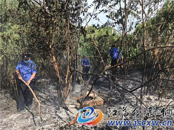 大约15分钟后,明火被顺利扑灭。为防止复燃,几位队员又协助及时赶到的消防队员对有冒烟的草木进行喷洒。最后,在确保无复燃地情况下才撤离现场悄然回到各自的工作岗位,继续开展巡查执法工作。
