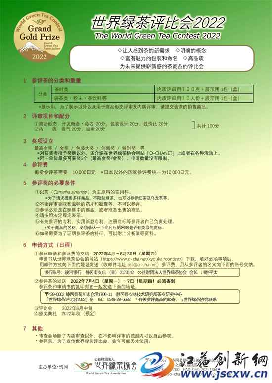 据了解,世界绿茶协会是日本静冈县政府成立的一个组织,旨在通过传播绿茶的传统和对其健康及商业特性的了解,进一步发展绿茶生产、文化和理念。会上有来自中国、日本、韩国等主要产茶国或地区的茶企茶品参评,审评专家团也是跨国组成,除重点考察茶的生长环境、工艺、外形、内质香气和口感等传统评选项目外,还从开发理念、命名、包装设计等方面进行严格审评,其影响程度堪称绿茶界的“奥斯卡”。