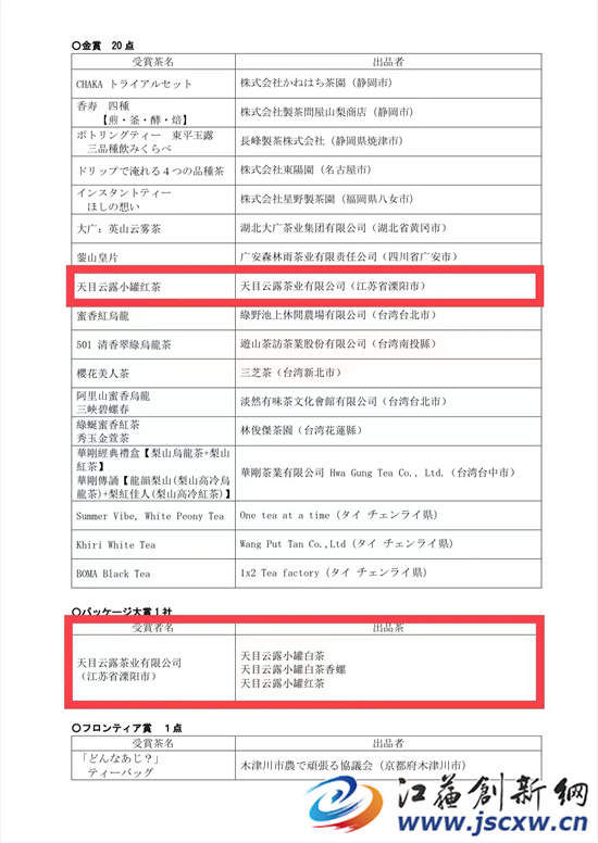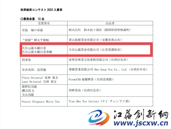 江苏创新网讯 近日,从日本评审现场传来喜报,世界绿茶最高级别评选活动之一的“2022世界绿茶评比会”评选结果揭晓,由江苏天目云露茶业有限公司出品的茶叶从世界各地95只送审参评绿茶中脱颖而出,揽获包含“最高金奖”在内的多个重磅奖项。三次参评,三次获奖!自2020年以来,天目云露品牌茶叶已经连续3年斩获世界绿茶评比会金奖,成为省内唯一一家“世界级金奖专业户”。这意味着,天目云露品质已然跻身世界一流水准,代表中国赢得世界级认可!