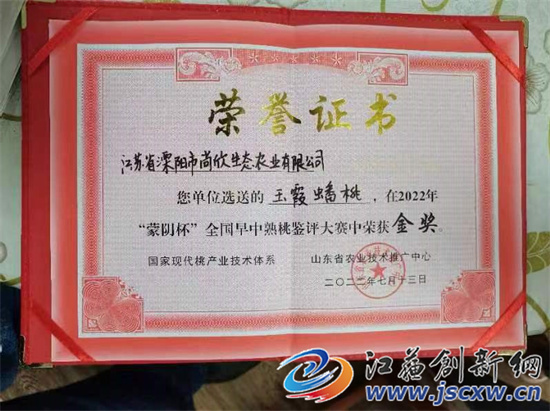江苏创新网讯 日前,由江苏省溧阳市尚欣生态农业有限公司选送的“玉霞蟠桃”在2022年“蒙阴杯”全国早中熟桃鉴评大赛中荣获金奖。
