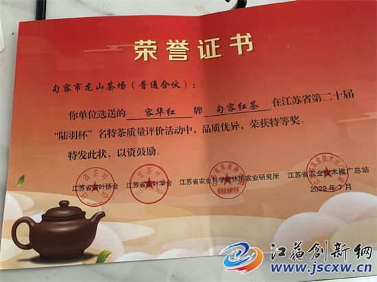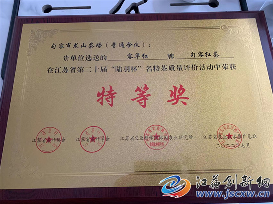 江苏创新网 11月29日,江苏省第二十届“陆羽杯”名特茶质量评比颁奖在无锡滨湖区山明水秀大酒店举行。句容市龙山茶场选送的“容华红”牌“句容红茶”再次荣获特等奖。