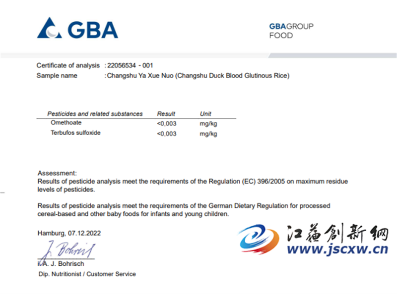 江苏创新网讯 近日,德国食品安全权威检测机构GBA实验室传来喜讯,来自江苏常熟的有机水稻产品——常熟鸭血糯,通过独立现场随机抽样方式,封样送检后,高标准通过8个大项、700余小项指标的检验,达到国际最为严格的欧盟婴幼儿食品级安全标准。