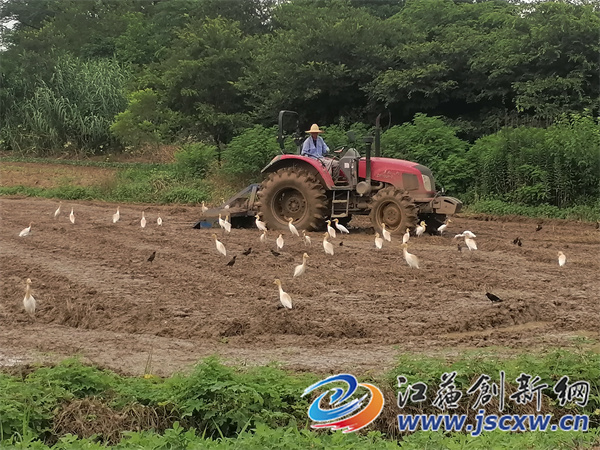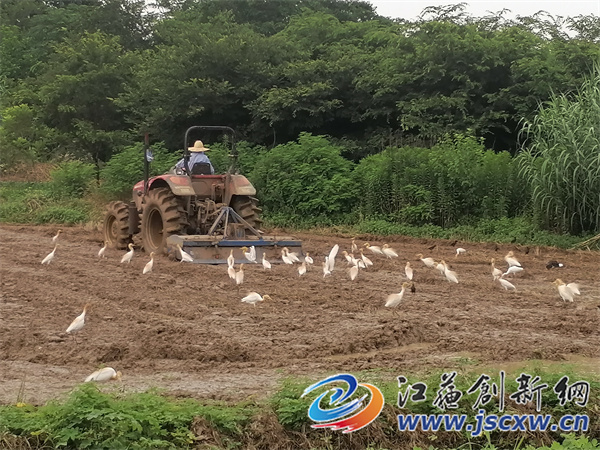江苏创新网讯 6月21日,刚进入梅雨季节的一周不到,同时也是农村插秧的高峰时刻。镇江宝堰徐巷村种粮大户刘龙华正在农田里用拖拉机耙田,只见成千上万,甚至更多的各种野鸟将他的拖拉机围追堵截,野鸟们的目的主要就是一个,那就是有活虫子吃了。