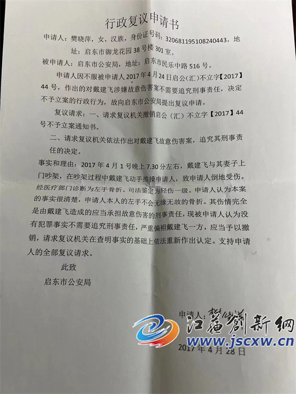 江苏创新网讯 最近家住启东市克明花园南区14号102室的樊晓萍老人,满怀悲愤投书媒体并通过法律途径,反映她被被控告人戴建飞故意殴打致轻伤一级,事件发生已达六年多之久,至今公安部门不予立案,无人问津,无人处理,强烈要求有关机关监督司法机关对该案立案侦查,追究被控告人戴建飞刑事责任。