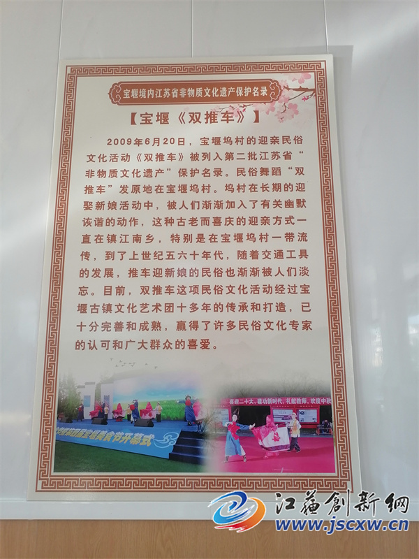 为此,业主李洪庚请来了当地文化界的朋友和文字制版的朋友查找资料,翻阅史书,用了近一周的时间,将千年古镇宝堰所有的省级非遗和市级非遗及省级文保单位和市级文保单位的资料,用图文并茂的方式制成了六块文化版面,贴在新店南面的一面新墙壁上。这六块版面集中介绍了宝堰镇的省级非物质文化遗产保护名录《宝堰双推车》,《南乡田歌. 宝堰车水号子》,市级非遗保护名录《宝堰干拌面》,省级文物保护单位《新四军四县抗敌总会纪念馆》和市级文物保护单位《前隍村新四军第一支队司令部旧址》,市级文物保护单位《清. 咸丰年间的太平桥》。