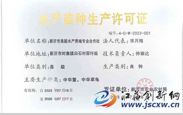 2023年初,合作社从中华鳖、中华草龟省级良种场分别引进亲本3000只、2000只,可年繁育中华鳖幼鳖10万只、中华草龟幼龟5万只。7月,获发县级中华鳖、中华草龟苗种生产许可证。合作社现合作社三大基地每年可生产大鲵商品鱼10万斤,产值2000万元;生产绿色商品青鱼300吨,产值2000万元;生产绿色商品鳖50000斤,产值500万元;培育中华鳖幼鳖10万只、中华草龟幼龟5万只,产值500万元;合计年总产值突破5000万元。
