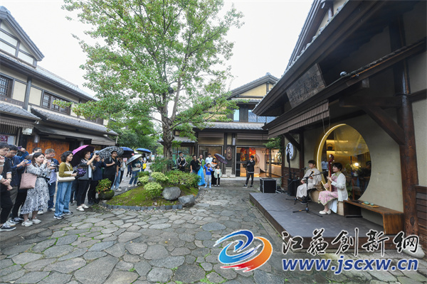 随着时间一到,在拈花湾禅意小镇里的亭苑楼台就有各个戏曲演出,有知名的黄梅戏天仙配片段,有国风唱腔的网红歌曲,有极具江南韵味的苏州评弹,像快闪形式突然出现,让游客可以驻足观看,也能在游玩之余有意外收获,感受国潮的不期而遇。