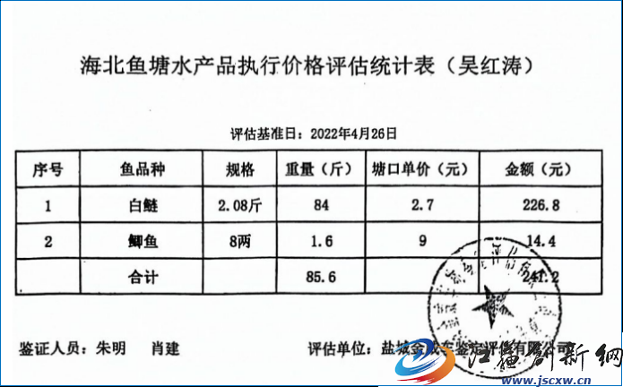 (图片说明:法院委托专门评估公司对吴红涛鱼塘水产品价值评估,其价值仅241.2元卖鱼款。但要收取200多万元“占用费”)