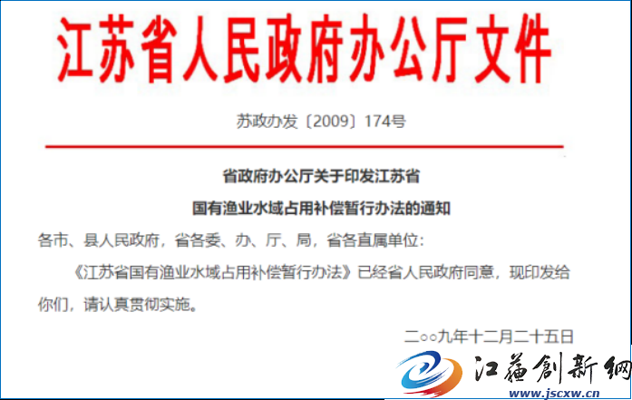 (图片说明:江苏省人民政府办公厅2009年出台“国有渔业水域占用补偿办法”)