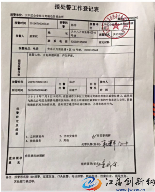 (图片说明:出警记录是养殖户向法院提交证据,但法院不审查。养殖户问法官,空鱼车不得进养殖区,老百姓的鱼怎么能出售?)