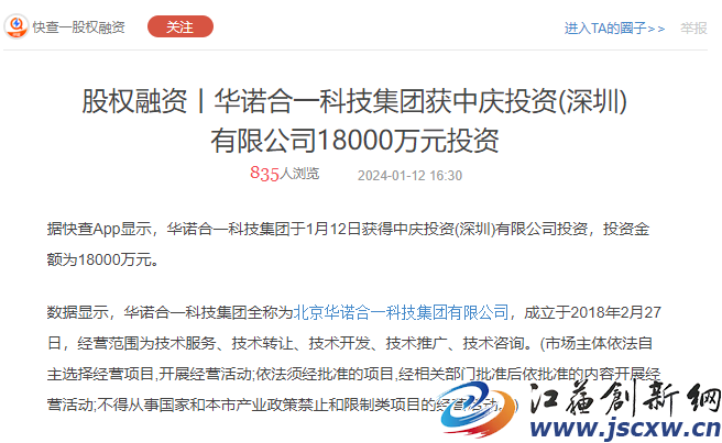 去年11月,有媒体报道称,北京华诺合一科技集团有限公司宣布以9.2亿估值完成1.8亿人民币股权融资。此次投资由中庆投资(深圳)有限公司领投。