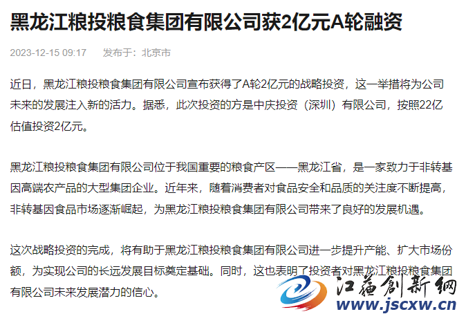 去年10月,有新闻报道称,黑龙江粮投粮食集团有限公司完成2亿人民币A轮融资,中庆投资(深圳)有限公司领投 。