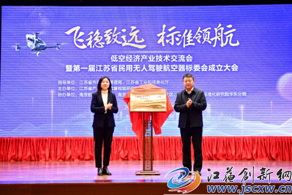 大会现场,江苏省工业和信息化厅装备工业二处处长熊斌谦,江苏省市场监督管理局标准化处副处长邵进进,共同为江苏省民用无人驾驶航空器系统标准化技术委员会揭牌。