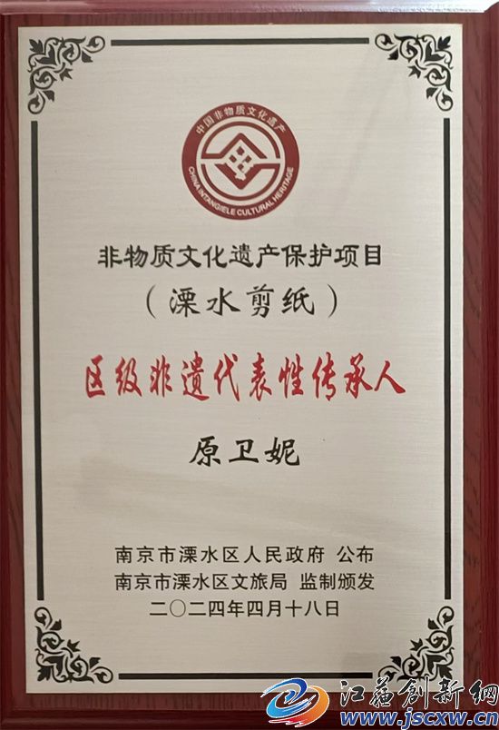 2024年2月, 非物质文化遗产南京溧水剪纸项目传承人。
