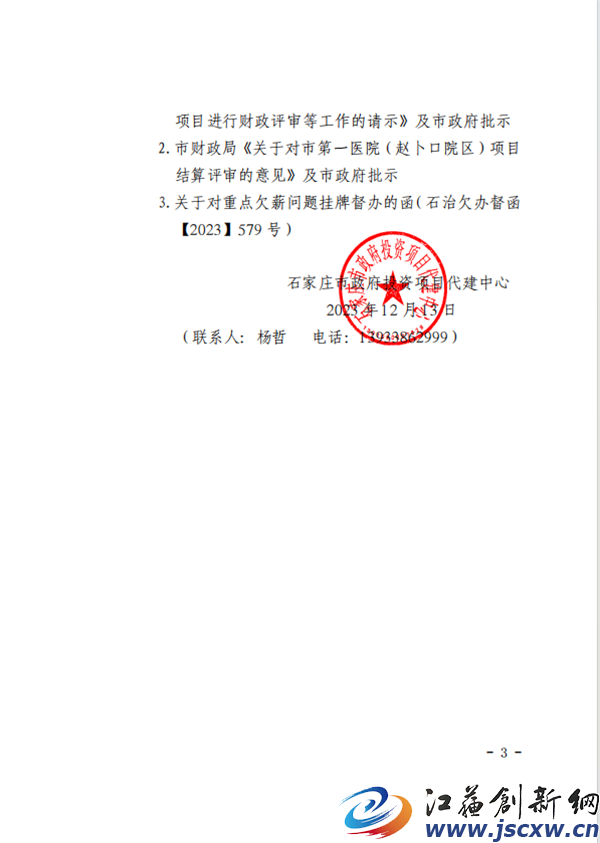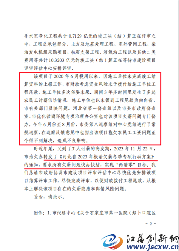 2023年12月,石家庄市政府投资项目代建中心发文,向石家庄市政府“关于优先安排石家庄市第一医院项目(赵卜口院区)进行决(结)算评审的请示”,恳请市政府协调市建设项目评审评估中心尽快优先安排该项目结算评审工作,尽快完成评审,以便财政拨付工程尾款,从根本上解决该项目存在的欠薪隐患和舆情风险问题。得到的批复中明确要求:所有欠薪问题快办快结,实现“两清零”目标。但结付工资的事情依旧石沉大海......