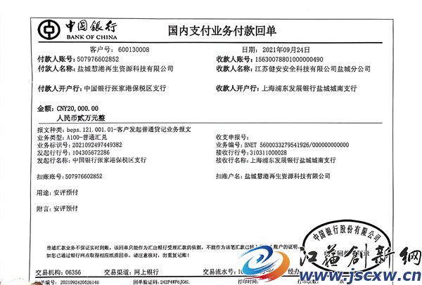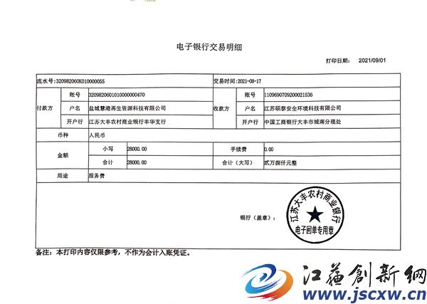 6.2021年8月,应安全生产部门的要求,公司委托江苏硕泰安全环境科技有限公司,代为办理“安全三同时”安全生产相关手续,并于2021年8月17日打款预付款28000元。2021年8月18日开始安装除尘罩等相关设施。同月,大丰港北区管理办公室强制要求臣生公司,给我司断电停产,还坚称不给慧港公司断电,臣生公司也要全部断电停产。9月中旬,不知什么原因,安全三同时手续办不下去,江苏硕泰相关负责人将预付的28000元现金退还给我公司。迫于公司生产的压力,我公司又找到江苏健安安全科技有限公司盐城分公司,并于2021年9月24日打款预付款2万元整,委托其继续办理安全生产的相关手续。