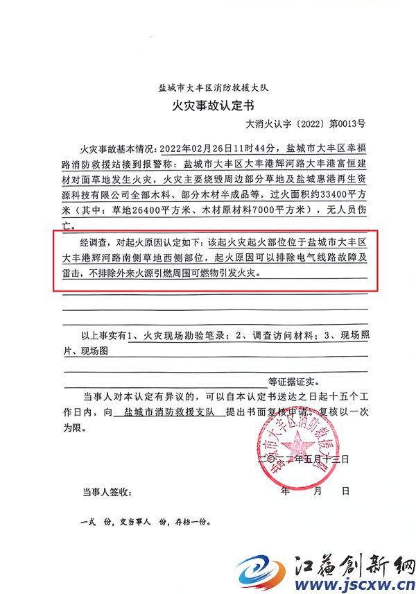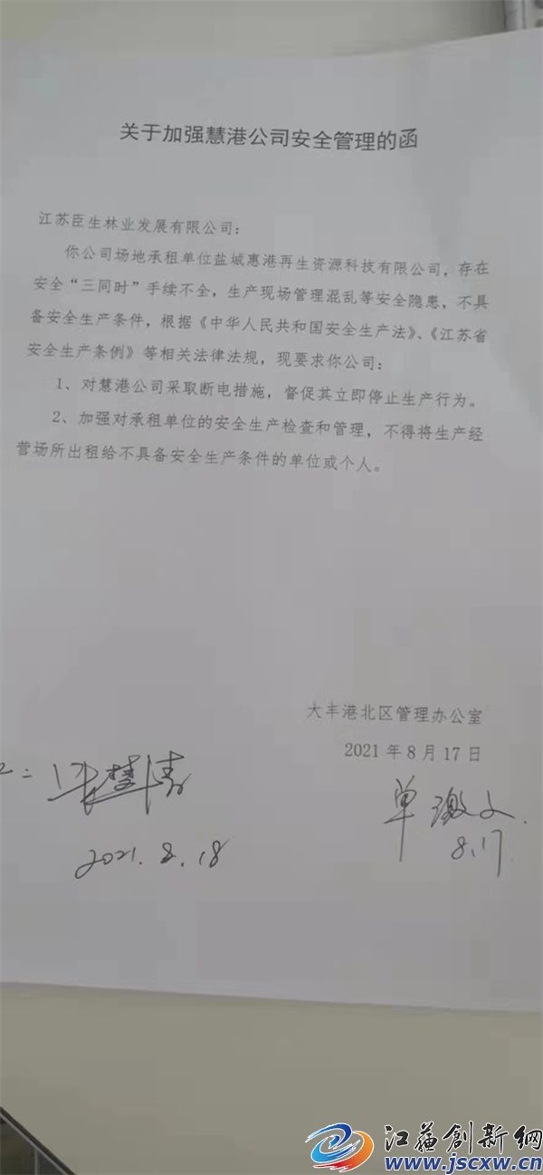 2022年3月16日,也就是火灾发生后半个多月,大丰港区有关安监负责人找到盐城慧港再生资源科技有限公司工作人员谈话。谈话内容就是说,你这类企业不符合入港区条件。其实,这次谈话明显是在补充前面没有做的工作,是在补充材料,因为前面从来没有过这样的谈话和笔录。当时,当事人还被要求签名确认。