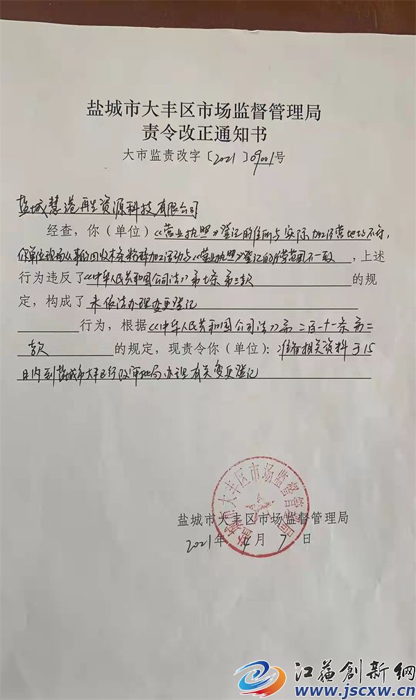 4.2021年3月,因汇鸿场地无法提供场地产权证明,为了规范经营,变更经营地址,我司重新租用了具备场地资质,并且租金更高的江苏臣生林业有限公司的场地。2021年4月前后,因接到同行举报后,市监局,安监局,环境局等多部门陆续上门检查,市监局于2021年4月7日出具书面通知要求我司对营业执照经营地址与经营范围不一致进行处理。这原本就在我们的计划之中。5月中旬,安监局直接对我们进行断电停产处理。于2021年7月1日我司变更了经营地址,增加了经营范围并取得了新的营业执照,设备等陆续搬到臣生的场地准备正式开展经营。