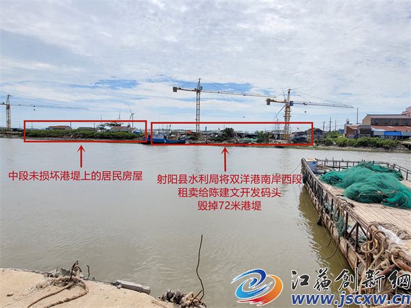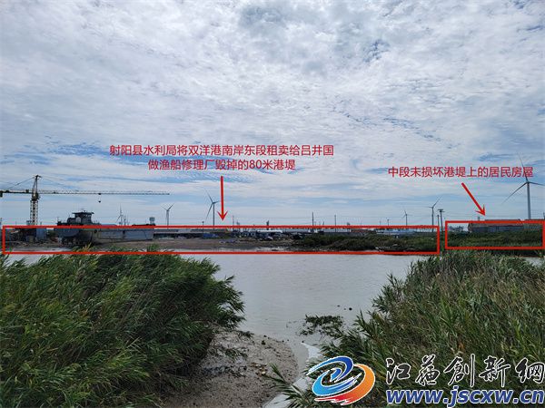 2012 年,射阳县水利局将港堤西段 72 米租给临海镇居民陈建文 20 年,租金 11 万元,承租人将港堤降近 2 米至地平面以下开发成码头。企业提出质疑遭时任县水利局五岸灌区进排水管理中心主任丁中兵无视。2014 年,丁中兵又将企业对面 92 米港堤租给吕井国开发渔船修造厂,租期 20 年,租金 17 万元,港堤被降近 2 米推平。