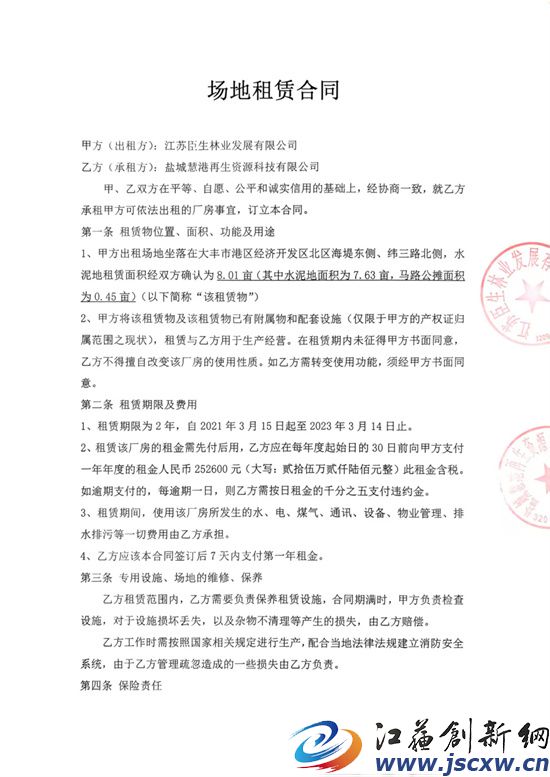 1.2020年9月,租用了大丰港再生资源产业园中江苏汇鸿国际集团大丰物流有限公司院内的水泥硬化空地,机器设备和员工陆续到位,于2020年10月中旬开始经营。