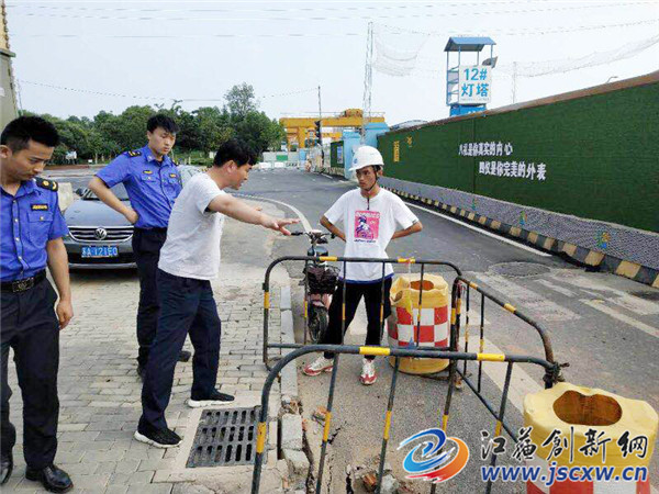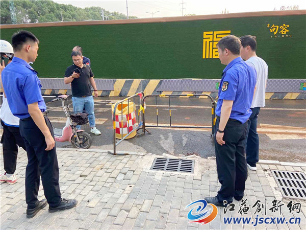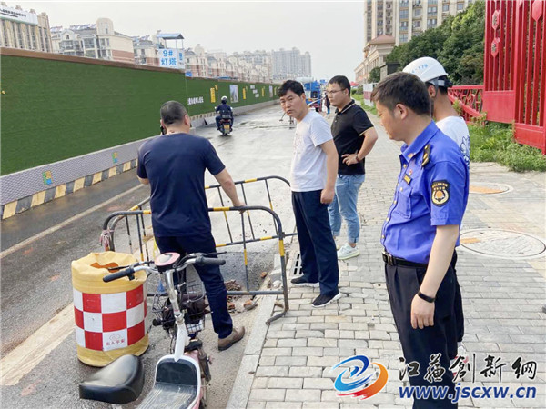 渣土管理科队员第一时间通知地铁施工单位中建八局前来处理。并立即找来水马,在此处布置路障,设置道路警示设施,值守路边疏导交通,防止车辆和行人发生意外情况,几分钟后相关部门工作人员相继到达现场。