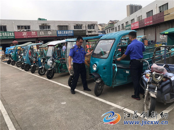 下午三点,在河滨北路,为保证南门菜场环境的整洁有序,市容二中队三名队员正在对市场内近六百辆电动自行车和电动三轮车进行推移规整。