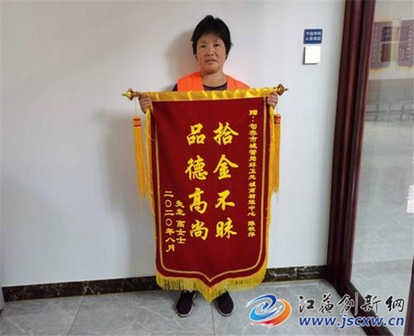 江苏创新网讯 高温酷暑,身边的好人好事不断涌现。8月16日下午,市民高女士委托朋友来到句容市城管局环卫处城南转运中心,将写有“拾金不昧、品德高尚”的锦旗送到环卫工人陈秋萍手中,感谢她良好的道德风尚和拾金不昧的高尚品格。