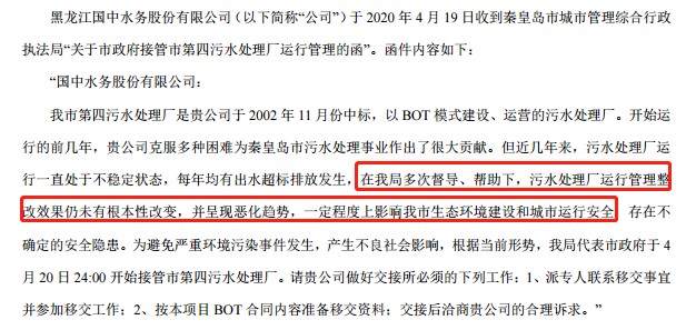对于被强制接管的原因,公告中提到秦皇岛市第四污水处理厂是国中水务于2002年11月份中标,近几年来,污水处理厂运行一直处于不稳定状态,每年均有出水超标排放发生,在秦皇岛市城市管理综合行政执法局多次督导、帮助下,污水处理厂运行管理整改效果仍未有根本性改变,并呈现恶化趋势,一定程度上影响秦皇岛市生态环境建设和城市运行安全,存在不确定的安全隐患。为避免严重环境污染事件发生,产生不良社会影响,根据当前形势,秦皇岛市城市管理综合行政执法局局代表市政府于4月20日24:00开始接管市第四污水处理厂。