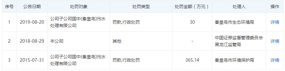 2019年8月,国中水务子公司秦皇岛污水处理公司排放的水污染物超过相关规定,秦皇岛市生态环境局决定对其处以30万元的行政罚款。