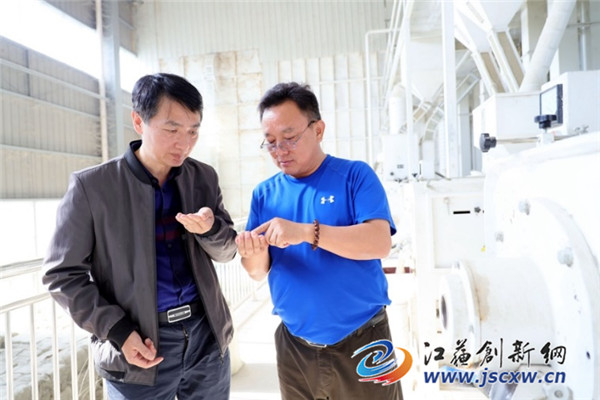 (朱董事长与全国种粮大户李敏涛在粮食加工厂品鉴绿色环保大米)