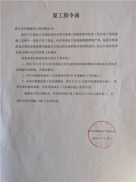 2020年7月,开发商突然向施工方发出复工指令函,要求施工方在收到函件后3日内无条件复工。