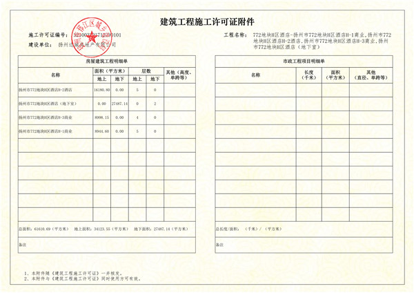 2017年12月29日,扬州市邗江区城乡建设局就772地块H区酒店项目颁发建筑工程施工许可证,载明合同工期为500天。