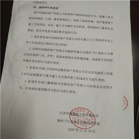 2020年11月17日,扬州边城房地产有限公司在未与江苏华城建筑工程有限公司解除施工合同,拖欠巨额工程款未给付未赔偿的情况下,既没有与华城公司商量,又没有书面通知,擅自进行二次招投标,违规向江苏广宇建设集团有限公司下发了《中标通知书》,并派人强拆华城公司扬州772地块H区酒店项目部的门头、护栏、设备和其他生活附属设施。此行为不仅令人气愤,更有失诚信道德,严重违反了《招投标法》。