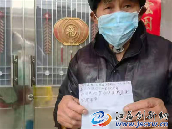 江苏创新网讯 3月23日上午,当镇江市丹徒区上党卫生院的杨霞等几个医护人员到上党镇封控区陶巷村来进行核酸检测的时候,其中一户老年村民突然从口袋里面掏出一张纸,纸条上的内容表达了对上党卫生院的医护人员感激。