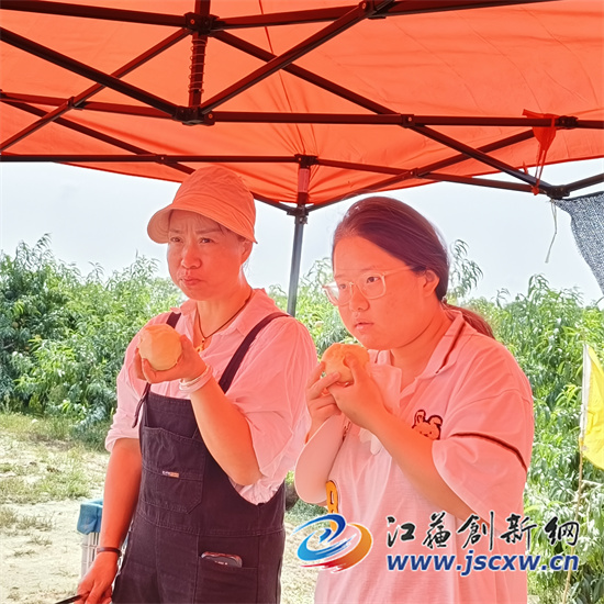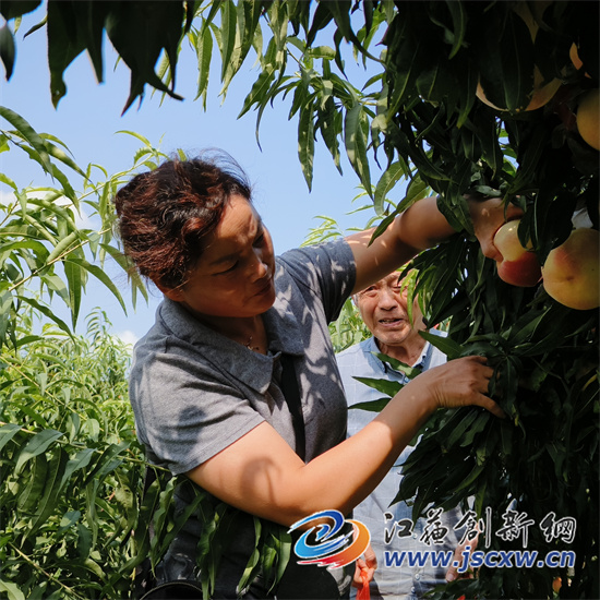 进入秋红金月农业发展有限公司(秋红1号脆桃基地),诱人的桃子香气就扑鼻而来,一颗颗红扑扑的果实挂满枝头。刘家桃园的主人刘士银和刘京父子对记者介绍到,2023年,因为晴朗天气多,气温也没像去年那么持续高温,加上吸取了去年的教训,加强了套纸袋等桃园管理,所以,果实品相很好,白里透红,吃起来又脆又甜,煞是诱人,采摘客很喜爱。