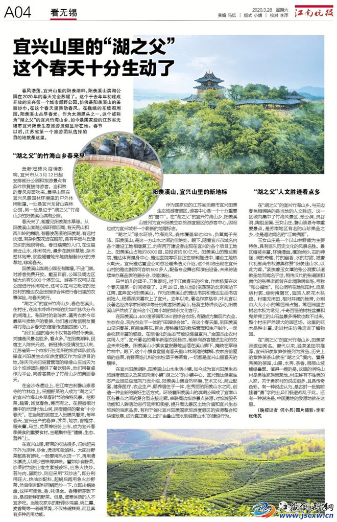 春风浩荡,宜兴山里的阳羡湖畔,阳羡溪山滨湖公园在2020年的春天完全苏醒了。这个于去年年初建成开放的宜兴第一个城市郊野公园,仿佛是阳羡溪山的美丽纱巾,在这个江南春天里舞动春风。在巍峨的东坡阁周围,阳羡溪山占尽春光。作为太湖源头之一,这个被称为“湖之父”的宜兴竹海山乡,叫湖㳇镇,如今是国家级的江苏省无锡市宜兴阳羡生态旅游度假区所在地。春节以后,江苏省第一个旅游团队选择的旅游目的地就是这里。