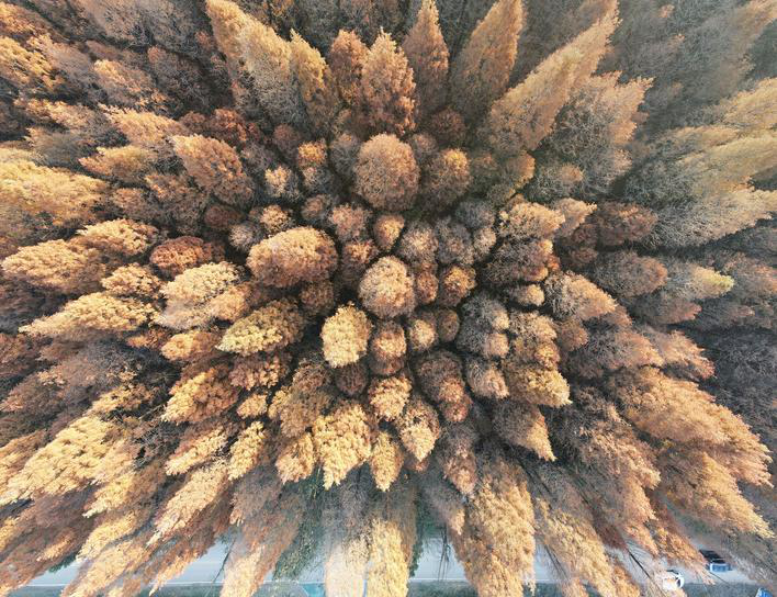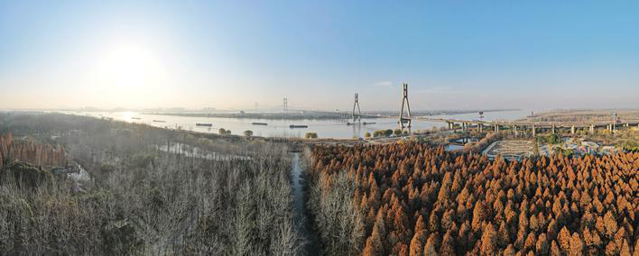 日,冬日时节,瓜洲省级湿地公园层林尽染,色彩缤纷的树叶与长江构成一幅美丽的冬日画卷,成为市民休闲、旅游的好去处。