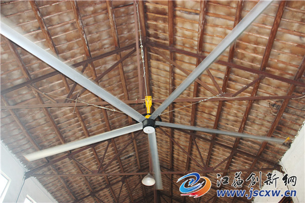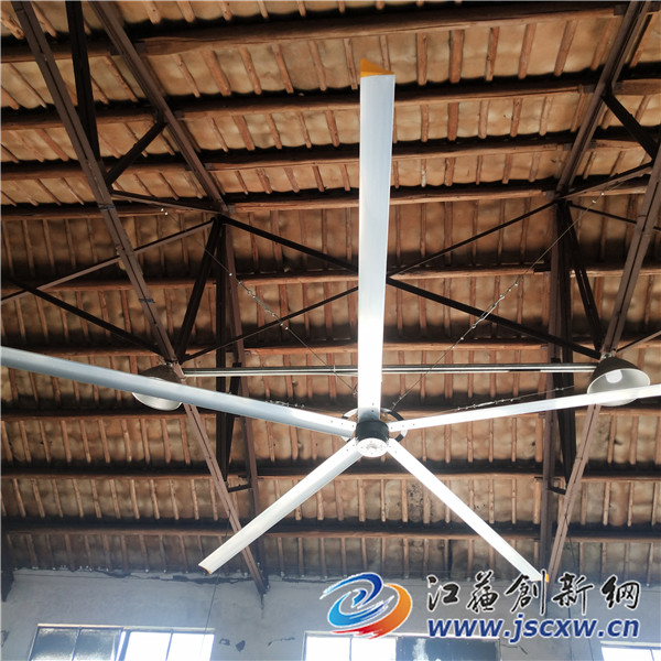 原来,该车间上方悬挂了两台由镇江鹏宏金属科技有限公司自主研发生产拥有知识产权的工业大风扇。风扇,家家都有,原理也简单,可重仅112公斤、扇叶直径却达7.3米的“巨无霸”工业大风扇的确少见。令人震撼的是:一是如此庞然大物,它的功率仅为1.5千瓦,一小时耗电比一台家用空调还少,能节省很多点;二是一台工业大风扇转速仅为10-50转/分钟,转速虽慢,风量可不小,覆盖面积更是可观,面积达800-900平方米。目前产品的种类分为吊式和手推式二种,其中吊式有四款分别是LUCCI-PH-7E/LUCCI-PH-6E/LUCCI-PH-5E/LUCCI-PH-4E,手推式有一款LUCCI-PH-2E。