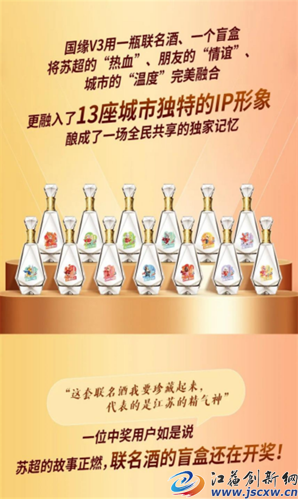 “国缘V3·苏超”联名酒一经推出,便火爆全网。“收藏记忆”成为广大球迷的追捧。“苏超”燃情出圈,引发的千万球迷狂欢、15亿粉丝围观,经历过的人,总想收藏一点珍贵的记忆。“国缘V3·苏超”联名酒 ,将苏超的“精神”、狂欢的“激情”、城市的“记忆”融入瓶中,以醉美的文化符号,留住永恒的瞬间。