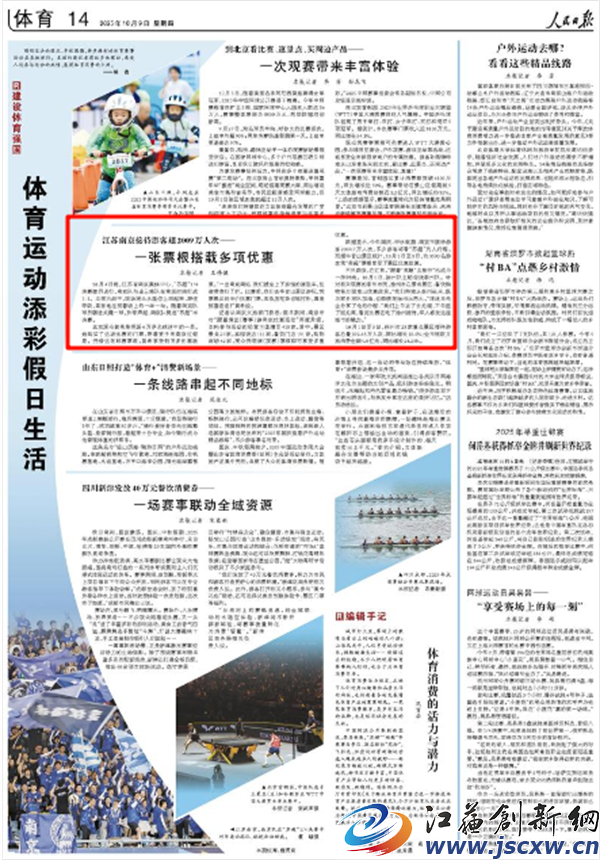 江苏创新网讯 《人民日报》2025年10月09日第 14 版《体育运动添彩假日生活(建设体育强国)》专题,发表《一张票根搭载多项优惠》,点赞江苏借苏超点燃假日经济,国庆中秋双节接待游客超2009万人次。中国共产党机关报给“苏超”这么高的评价,也算一个奇迹。国缘V3为《人民日报》喝彩。
