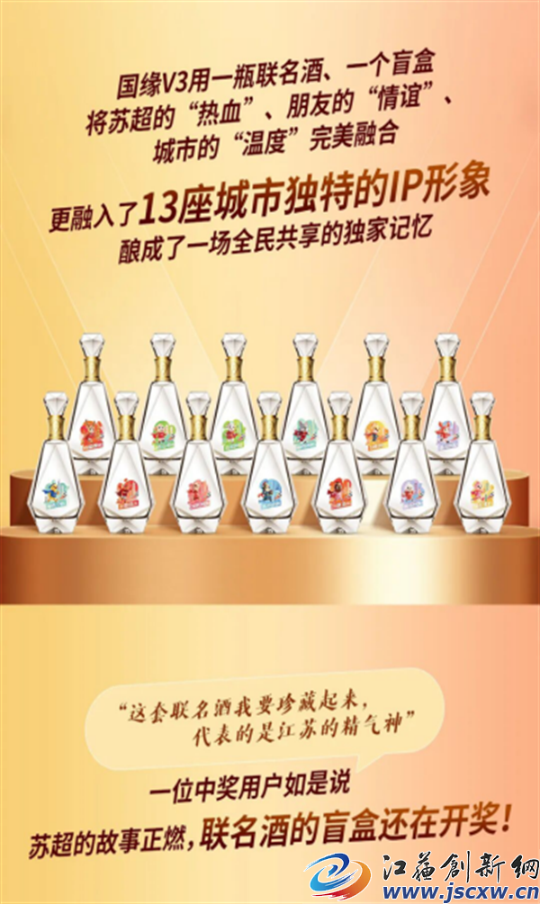 作为第一个官方战略合作伙伴,随着苏超的爆燃,国缘V3的品牌影响力大涨。国缘V3又以一种意想不到的方式推出最炫文创产品——“国缘V3·苏超”联名酒,一鸣惊人,成为了全民争抢的焦点。