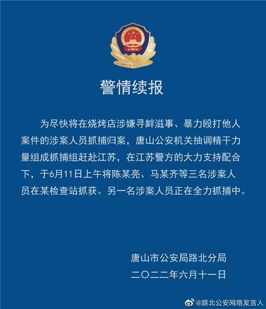 江苏创新网讯 北京6月11日电 (郝萍、吴楠)6月11日,唐山市公安局路北分局发布警情续报,为尽快将在烧烤店涉嫌寻衅滋事、暴力殴打他人案件的涉案人员抓捕归案,唐山公安机关抽调精干力量组成抓捕组赶赴江苏,在江苏警方的大力支持配合下,于6月11日上午将陈某亮、马某齐等三名涉案人员在某检查站抓获。另一名涉案人员正在全力抓捕中。(图文/郝萍 吴楠)