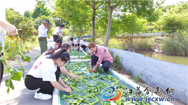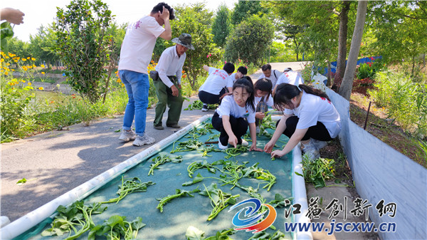 图为镇江市劳模胡天娣指导学生制作鱼菜共生浮床
